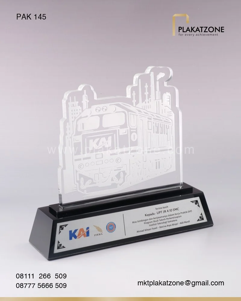 Sebagai bentuk apresiasi, sebuah plakat akrilik elegan diberikan kepada pihak KAI. Desainnya menyerupai siluet lokomotif yang khas, mencerminkan identitas Teknik Perkeretaapian. Plakat Teknik Perkeretaapian ini menjadi simbol terima kasih atas bimbingan dan kerja sama selama pelaksanaan kerja praktik.